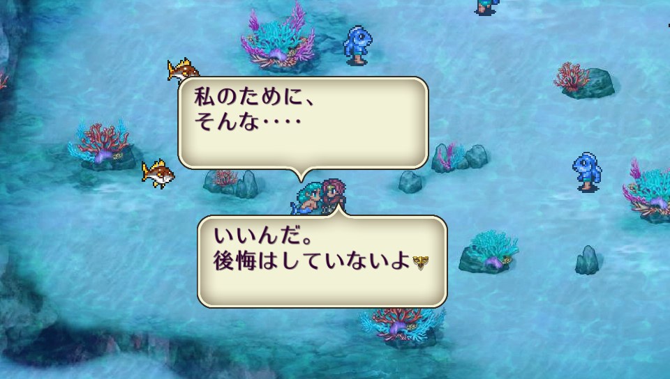 イベント画像の続き 閉じる ジェミニ皇帝になったので人魚イベント実行 酒場で惚れた人魚に男皇帝が海の中に行けるアイテム(人魚薬)で会いに行くと 3回目は地上に戻れなくなり画像3〜4枚目になって年代ジャンプします… 2人はいいんだろうけど他メンバーも道連れ笑 あとやっと千手観音と高速ナブラ閃いた💡やった〜 #ロマサガ2 2023/02/09