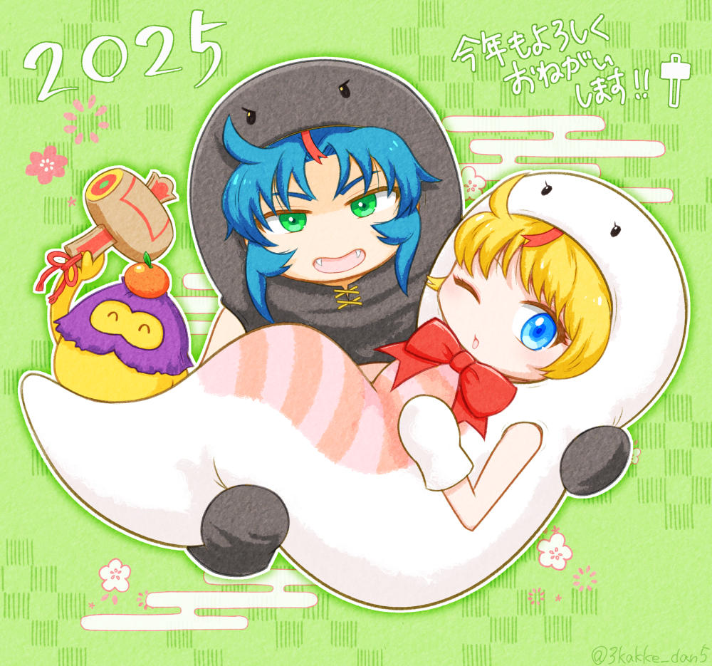 ヘビの着ぐるみを着ているカノとテテとドラクエモンスターのおおきづちです。